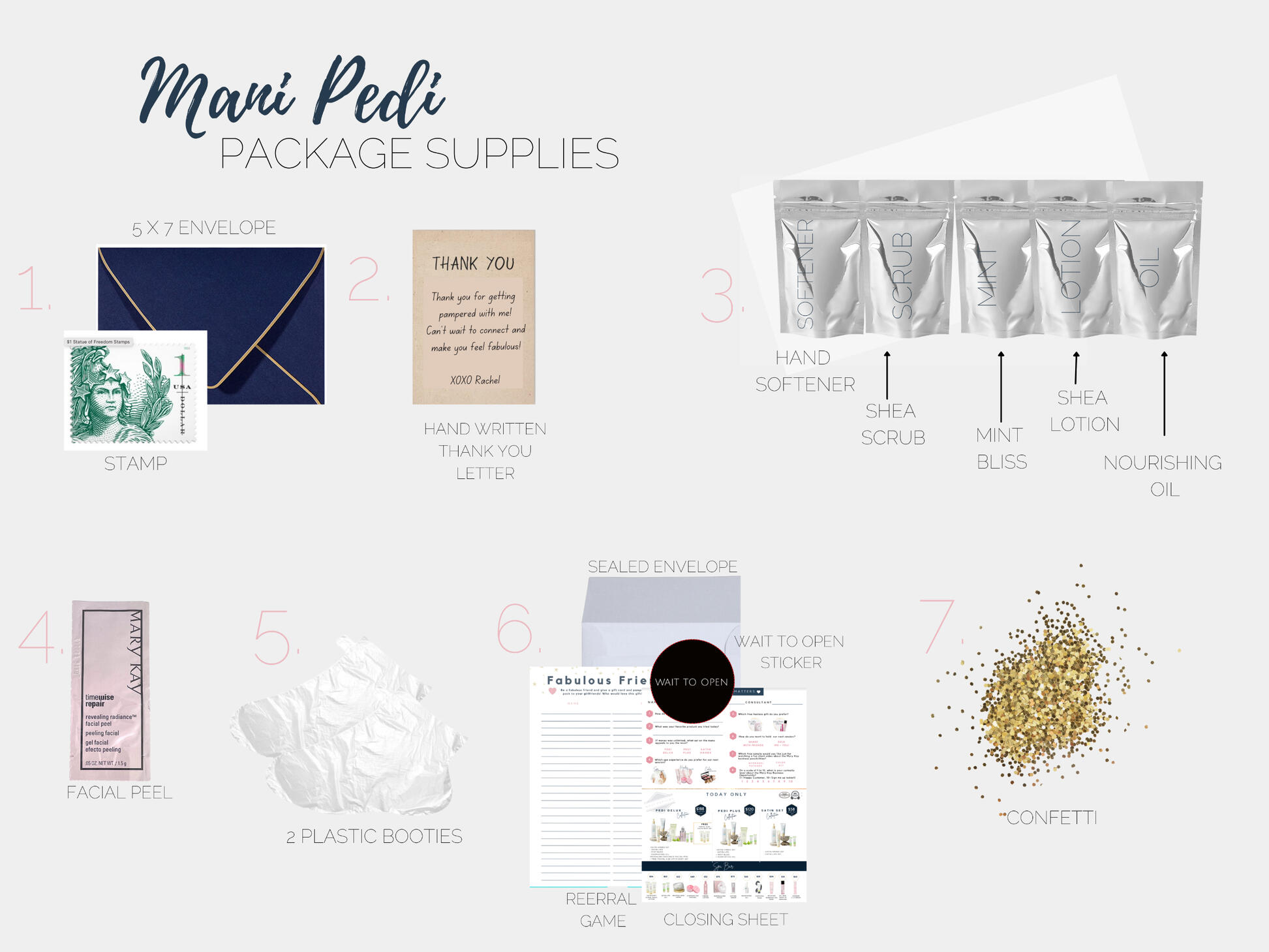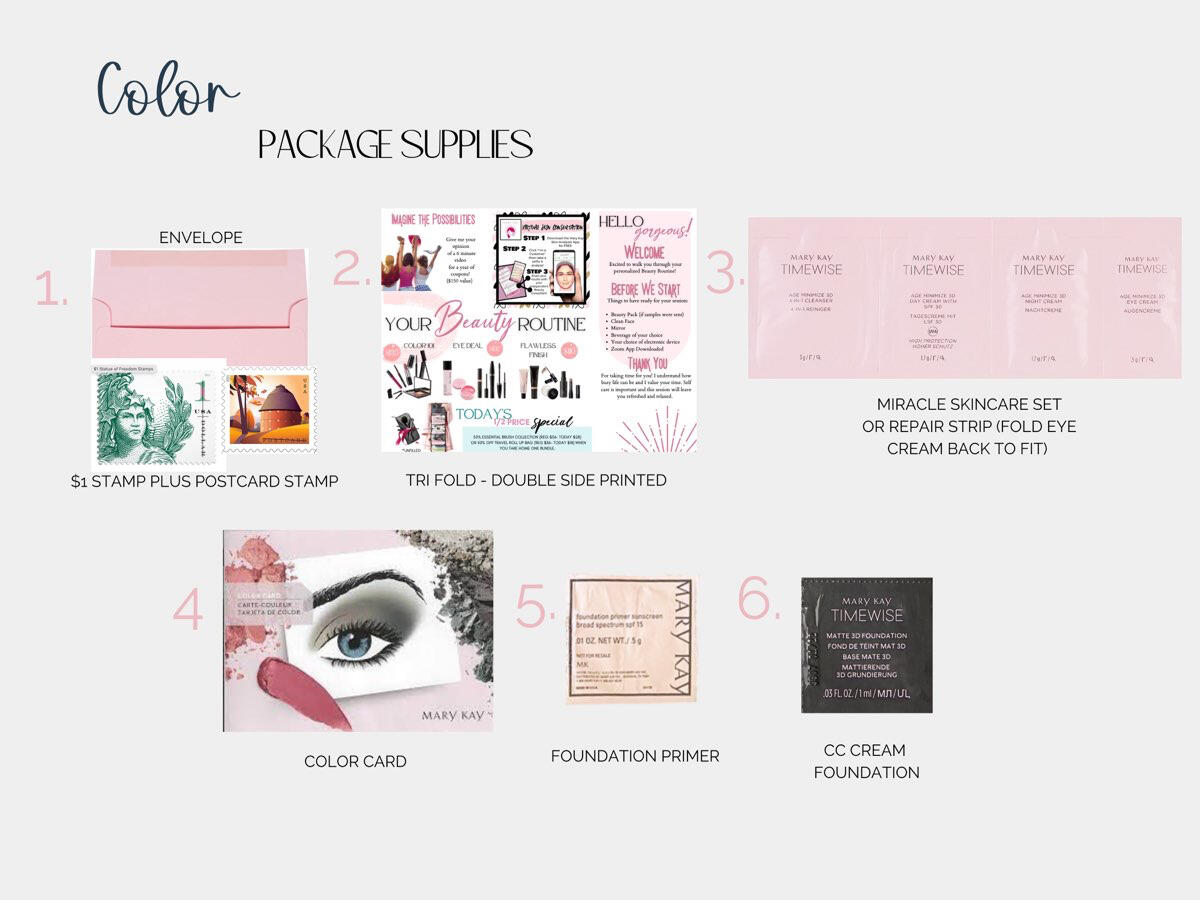 Each mirror should be packed with a clear disposable tray, throw away washcloth, pen and 2 cotton rounds.I would recommend having 1 of each skin care diagram printed in color, double sided for each face tray. these won't ever be thrown away, you just put the clear tray over them for each appointment and switch it based on which skincare you customer is trying. Use coordinating set closing sheets. Color-coded for ease of use!I would also suggest getting: