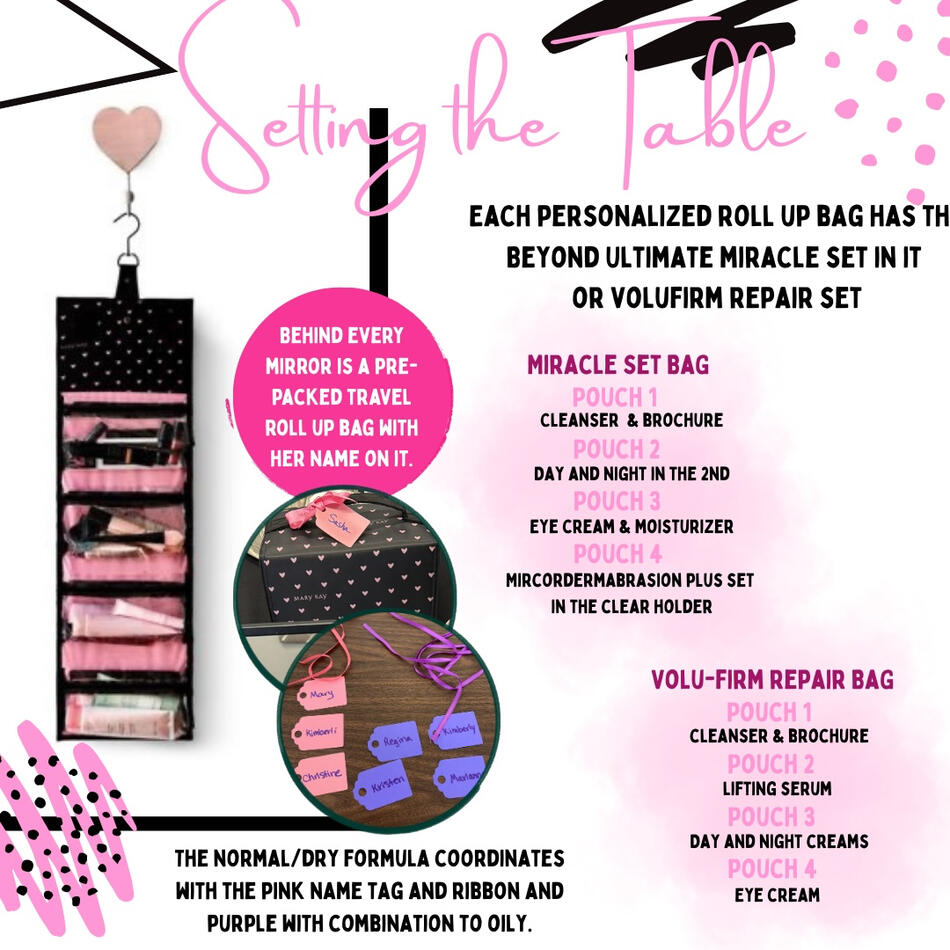 Profile Sheet is at the place setting and during the party when I do referrals I hand out this paper and ask her to do the think pink on the back while I do the individual closes with everyone.I put the 2nd date/half back coupon at their place setting. I talk about it during their appt. This encourages sales and new skincare customers and also rebooking that day! Encourage her to invite the ladies she put down as referrals!